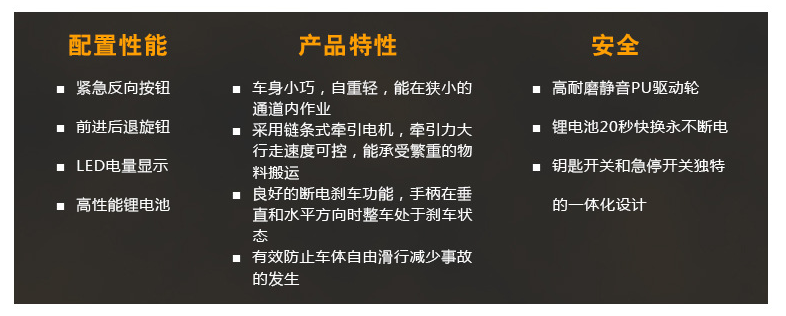 采用進口驅(qū)動輪,配置可靠的盤式剎車系統(tǒng),動力強勁,操控自如,配有大容量的高效能電池,電量持久,帶電量顯示表,低電壓報警燈,采用重型設計,結(jié)構(gòu)緊湊,操作視野開闊。